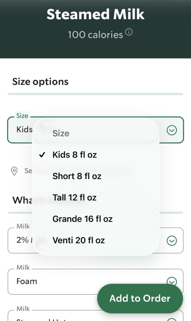こちらの飲み物には、子ども用のサイズもあります。ミルクの変更やフォームの量もカスタムできます。