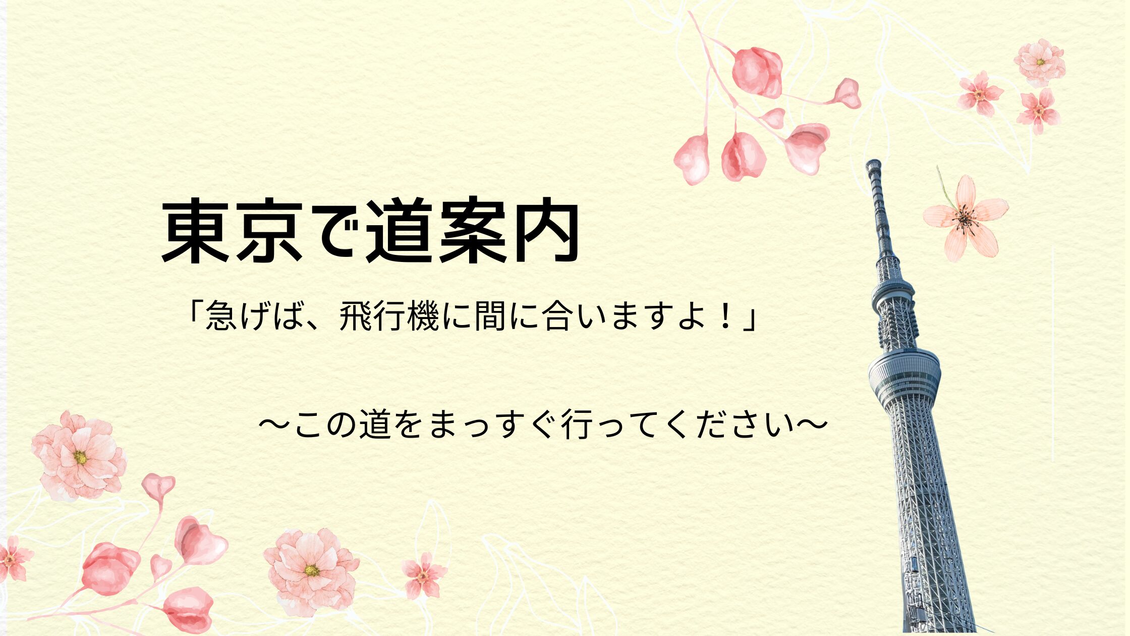 TAG 道案内 地下鉄の道案内はこれだけ!「浅草寺へ行く」 2026.04.25 道案内英語 tsubasa-note 英語が話したい! 上野駅へはバスで行くのが便利ですよ! 2026.02.21 道案内英語 tsubasa-note 英語が話したい! 道案内「この道をまっすぐ行ってください」 2025.11.15 道案内英語 tsubasa-note 英語が話したい! 困っている外国人観光客を助けてあげたい!道案内フレーズ 2025.11.01 道案内英語 tsubasa-note 英語が話したい!