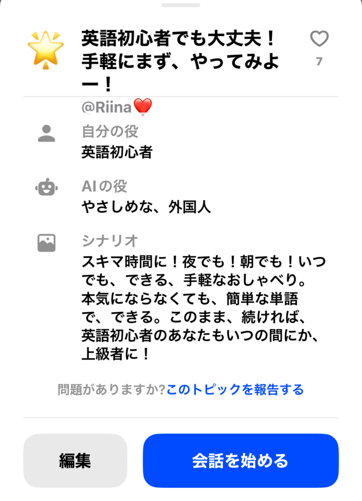 AI英会話「スピーク」の「フリートーク」の魅力の一つは、あなたの興味や目的に合わせた、あなた専用の会話環境を比較的簡単に作れることです。