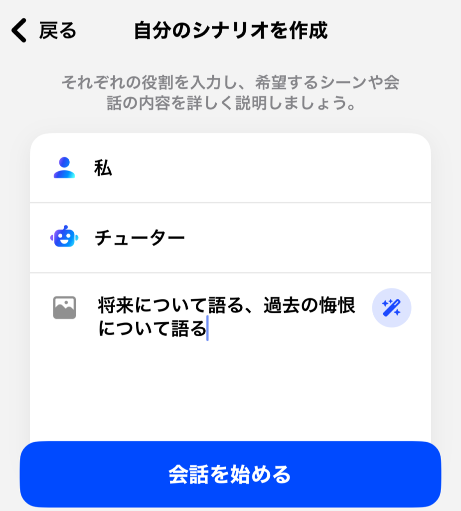 AIとユーザーそれぞれの役割やテーマを決めてから会話を始められるため、