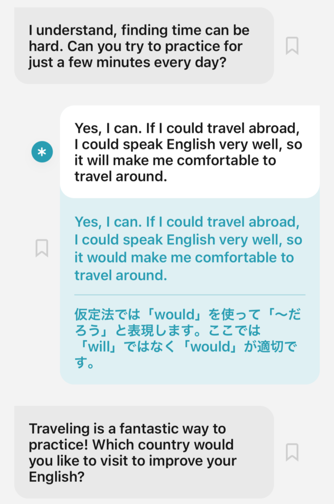 あなたが話したかった表現を何度も使って練習でき、間違えればしっかりとフィードバックをくれるAIは、英語学習における最高の話し相手ではないでしょうか。