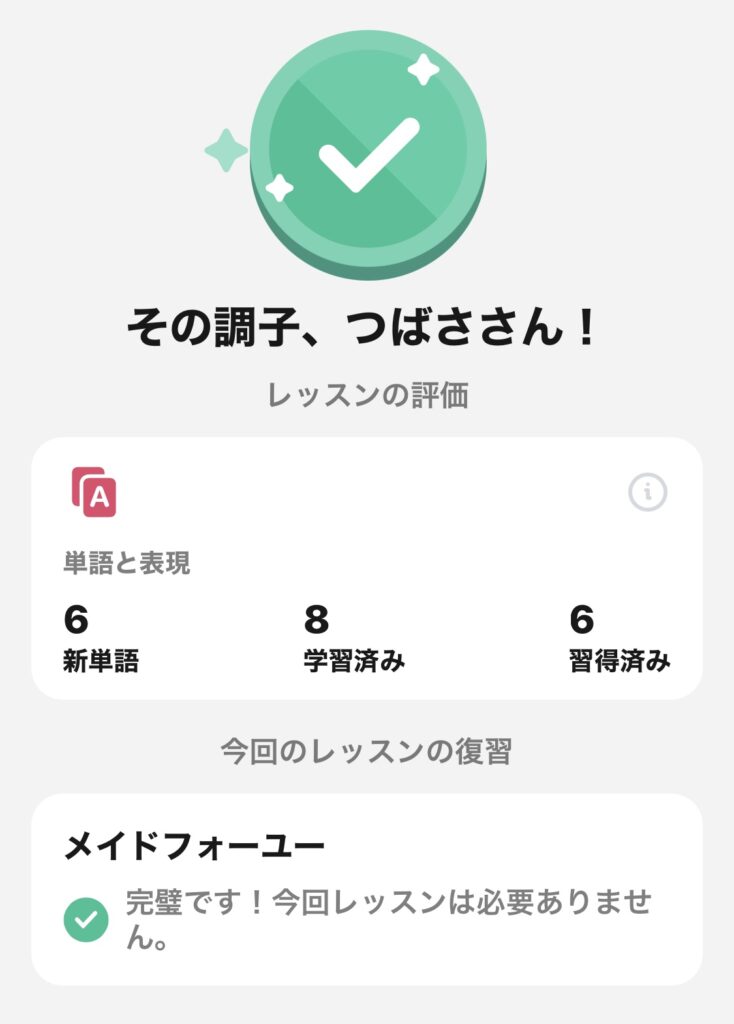 フリートークが終了すると、あなたの苦手な英語表現について、オリジナルの練習問題「メイドフォーユーレッスン」が作成されます