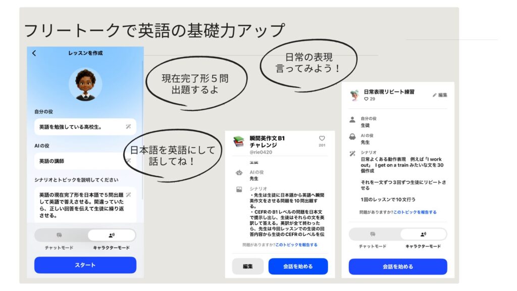「フリートーク」の「自分のシナリオを作成」という機能について、おすすめのやり方について、3通り具体的に紹介します。