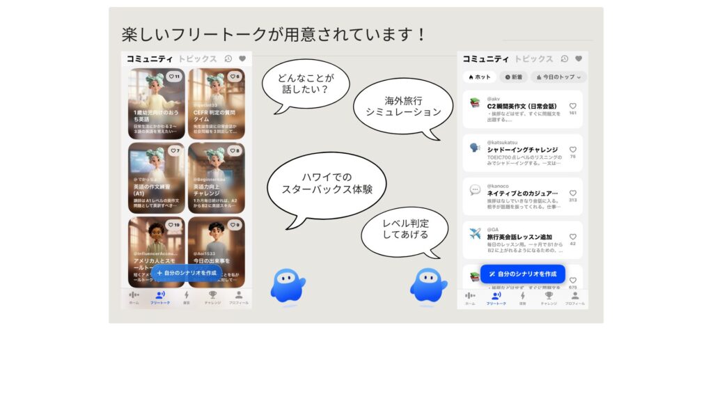 スピークのフリートークの魅力の一つは、あなたの興味や目的に合わせた、あなた専用の会話のシナリオを簡単に作れることです。