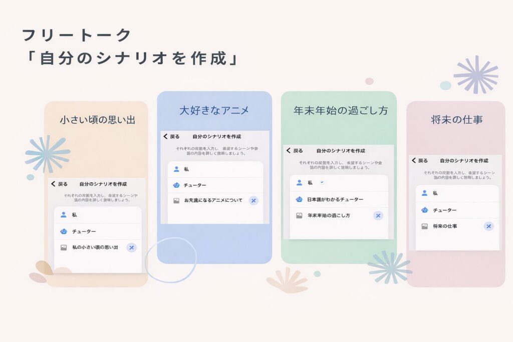 スピークのフリートークの魅力の一つは、あなたの興味や目的に合わせた、あなた専用の会話のシナリオを簡単に作れることです。