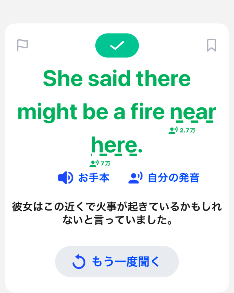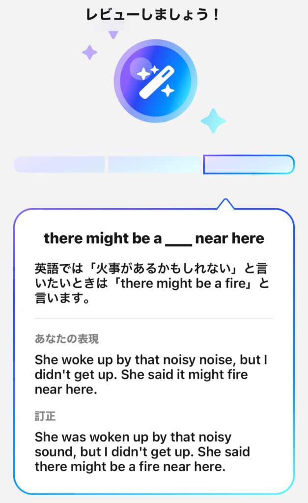 ★マークの部分をタップすると、「ほかの使い方も確認しましょう」というメッセージとともに、あなたの話した会話を訂正し、その理由を説明してもらえます。