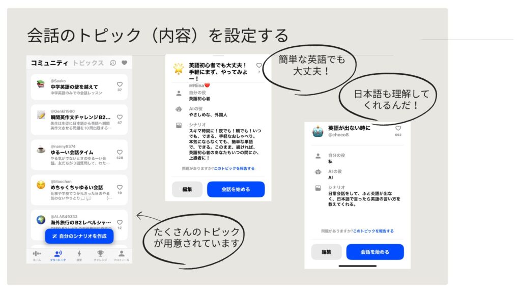 画面下のナビゲーションメニューから「フリートーク」を選ぶと、「コミュニティ」にいろいろなトピックが出てきます。その中から気になるトピックを選んで、会話を実践してみましょう。